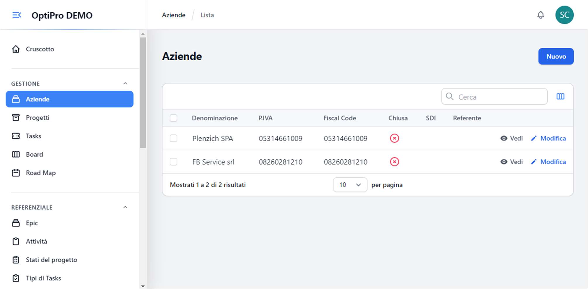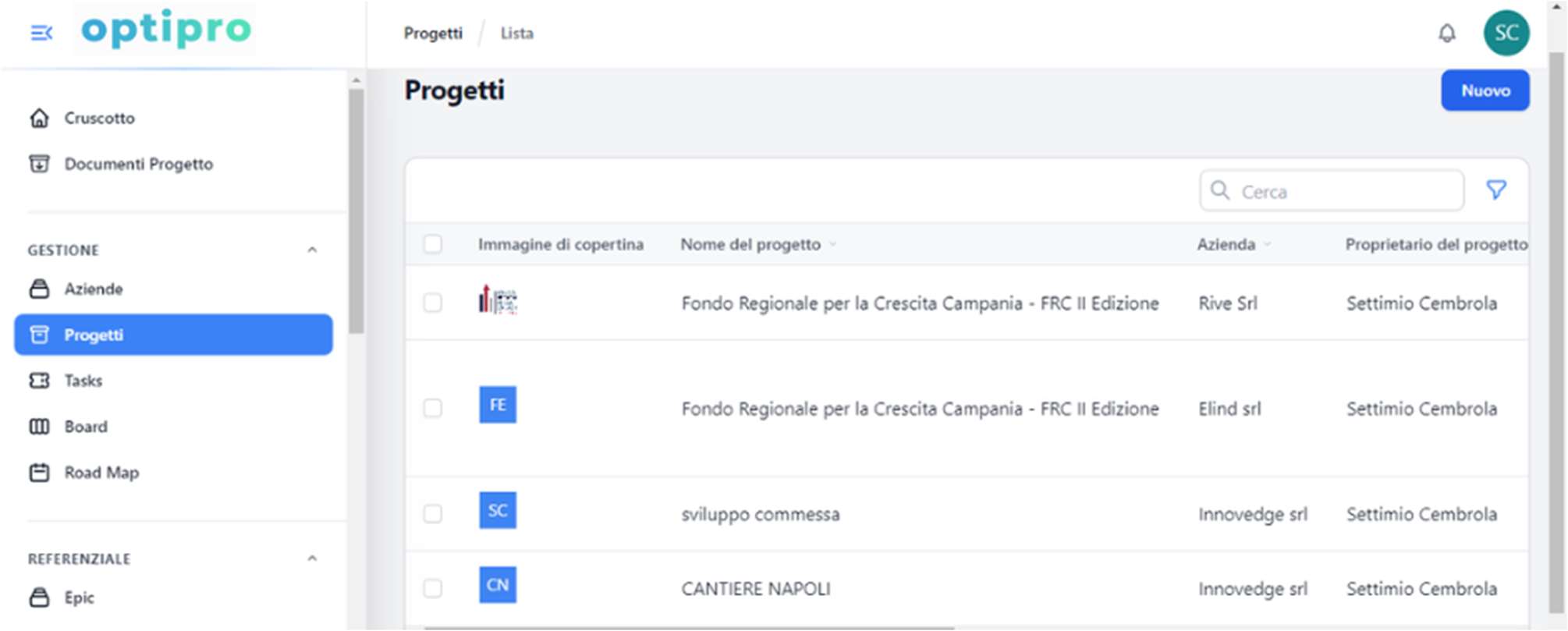 - Elenco dettagliato dei progetti con immagine di copertina, nome, azienda e proprietario.