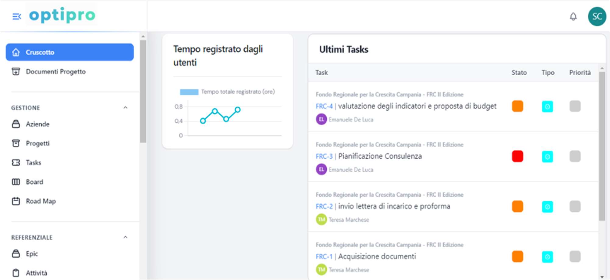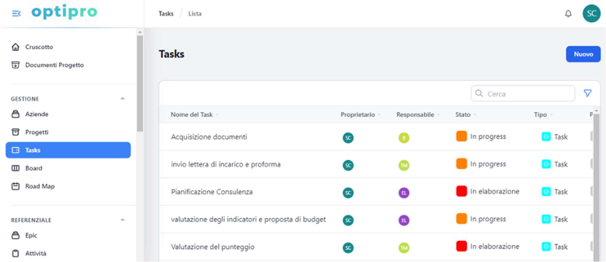 - Elenco attività con informazioni su nome, proprietario, responsabile e stato (In Progress, In Elaborazione).