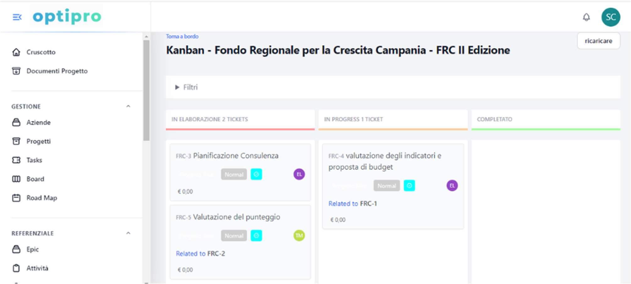 - Visualizzazione Kanban con colonne In Elaborazione, In Progress, Completato.
