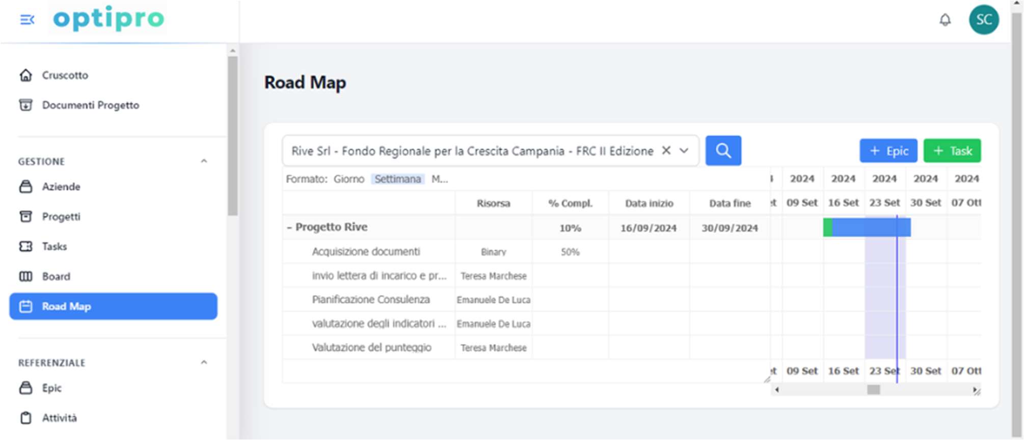 - Timeline con task, assegnazioni e percentuali di completamento.
